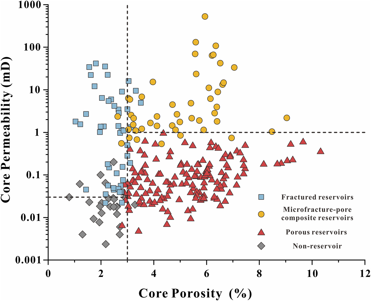 Scatter plots showing the relationship between porosity and permeability for different reservoir types. The black dashed lines indicate the classification thresholds for porosity and permeability for different reservoir types. All data points were identified using thin sections impregnated with blue epoxy resin and SEM images.