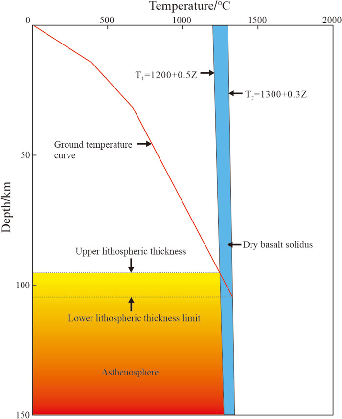 The thermal lithosphere refers to the outermost layer of the Earth’s lithosphere, which allows for heat conduction. Beneath the thermal lithosphere lies the asthenosphere, where thermal convection occurs due to prolonged high temperatures (Morgan, 1984; White, 1988). It is widely recognized that the thickness of the thermal lithosphere can be defined based on changes in the petrophysical properties of rocks caused by variations in the temperature field (Artemieva and Mooney, 2001; Artemieva et al., 2017). Rudnick et al. (1998) defined the base of the thermal lithosphere as the depth at which the temperature curve intersects with the solidus line of dry basalt or the mantle adiabat. This depth represents the thickness of the thermal lithosphere. Heat conduction within the lithosphere follows 1D heat conduction Equations 6, 8. In this study, two adiabats were used as the upper and lower limits (Equations 9, 10, respectively) of the bottom boundary temperature of the thermal lithosphere (Artemieva et al., 2017). The thickness of the thermal lithosphere is calculated as the arithmetic mean of the depths at which the upper- and lower-limit temperature curves intersect (Figure 3).