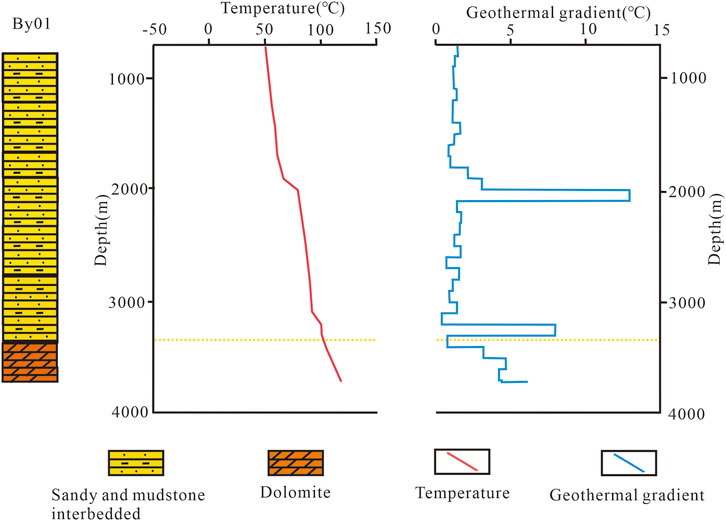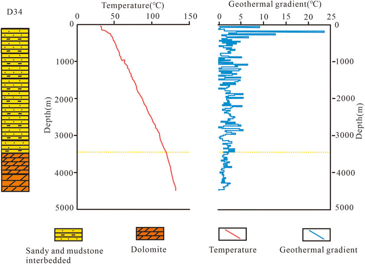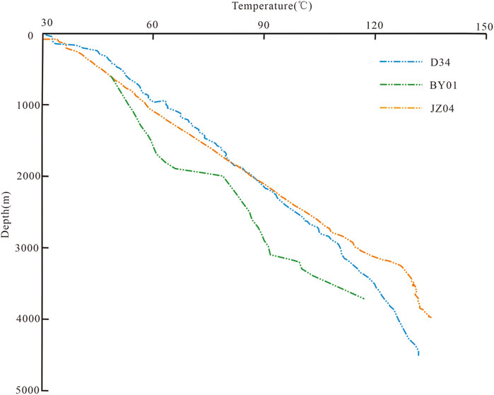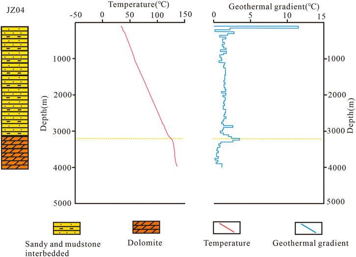 Temperature measurements in boreholes are an important method for acquiring data on deep geothermal fluids. This method reflects the temperatures of deep rock layers by measuring the temperatures of drilling fluids within the boreholes. The state in which the temperature of drilling fluids is consistent with that of the surrounding rocks is known as thermal equilibrium. The quality of temperature data obtained from boreholes depends on the relationship between the temperatures of the drilling fluid and the surrounding rocks, as well as the time required to achieve thermal equilibrium between them. Based on the time intervals between drilling completion and temperature measurements in boreholes, temperature measurements can be categorized as steady-state, quasi-steady-state, and instantaneous. Steady-state measurements are acquired after thermal equilibrium has been achieved in the boreholes, providing the most reliable data that accurately reflects the temperature conditions in the study area. Quasi-steady-state measurements are conducted when thermal equilibrium is nearly reached. In this case, the obtained temperatures are close to the actual formation temperature. Instantaneous measurements are performed shortly after drilling is completed. Since thermal equilibrium is not reached in this case, the measured temperatures do not truly represent the formation temperature (Rao et al., 2013; Zuo et al., 2013; Duan et al., 2023). The temperatures in borehole JZ04 were measured in a quasi-steady state with thermal equilibrium nearly achieved after an undisturbed period of 60 h. The temperatures obtained from borehole JZ04 were thus close to the actual formation temperature. The KH-3S integrated computerized logging system was used, with a test speed set at 10 m/min. This system allowed automatic measurements at a constant speed from the bottom upward. The borehole recorded a bottom-hole temperature of 135 °C, establishing it as the geothermal well with the highest temperature at a depth of 4,000 m among geothermal carbonate reservoirs in the Beijing-Tianjin-Hebei region.