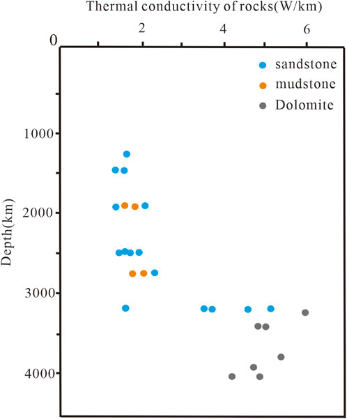 This study tested 30 core samples formed from the Cenozoic to the Proterozoic, including Cenozoic sandstones, conglomerates, and mudstones, as well as Mesoproterozoic dolomites, conglomeratic dolomites, and micritic dolomites. The depth variations in the thermal conductivity of rocks (Figure 8) reveal that the thermal conductivity of rocks in the study area is more closely associated with rock type than with depths. Specifically, dolomites exhibit higher thermal conductivity, while sandstones display lower thermal conductivity. The thermal conductivity values of rocks in the study area range from 1.53 W/(m·K) to 6.6 W/(m·K), with an average of 3.52 W/(m·K).