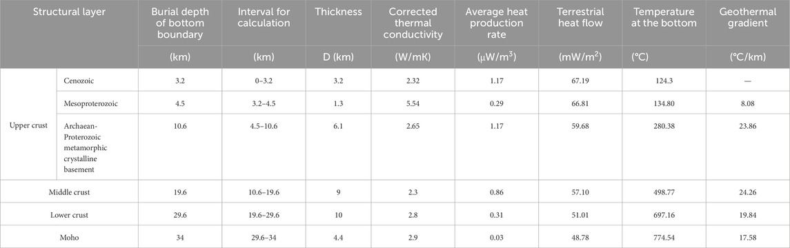 Table 3 presents the distribution of calculated temperatures at depth in the study area, with the crustal structure above the Moho divided into five layers. For strata above the Jixianian strata, the temperatures were determined based on temperature measurements in boreholes. For strata beyond the reach of deep drilling, subsurface temperatures were calculated using Equation 7 after correcting thermal conductivities with Equation 2.