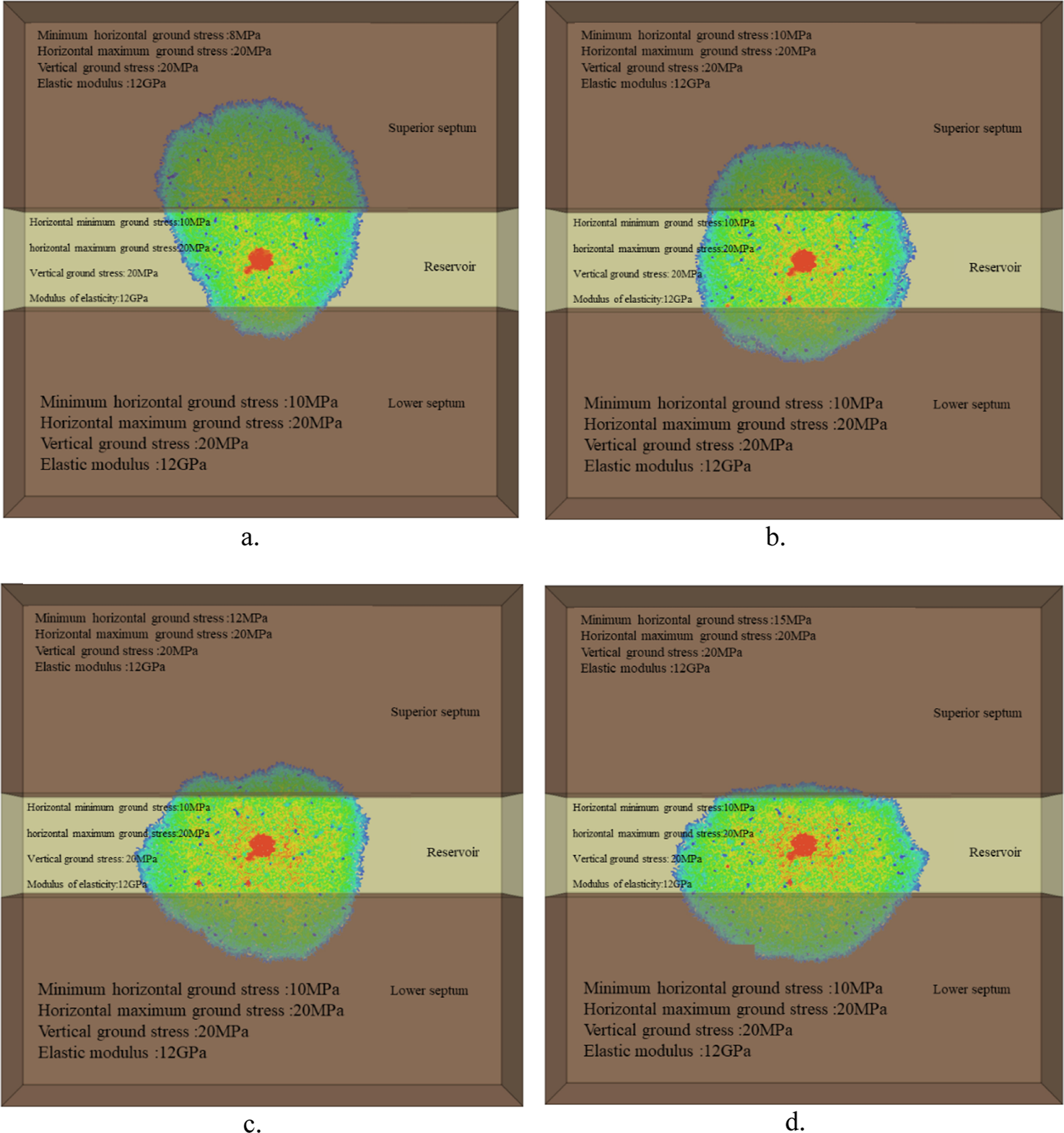 Influence of minimum horizontal ground stress difference of different reservoirs on joint height expansion. (a) The minimum horizontal ground stress of the upper compartment is 8 MPa. (b) The minimum horizontal ground stress of the upper compartment is 10 MPa. (c) The minimum horizontal ground stress of the upper compartment is 12 MPa. (d) The minimum horizontal ground stress of the upper compartment is 15 MPa.