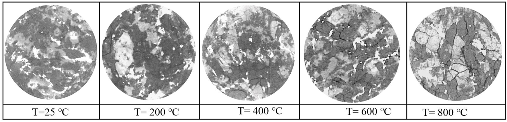 Based on the CT scanning experiments, grayscale scan slices of the gneiss specimens were obtained, revealing the evolution of two-dimensional (2D) pores within these specimens, as shown in Figure 5. Taking a typical scan slice from the central part of the specimen as an example, it is evident that the changes in porosity during the heating process exhibit significant heterogeneity. In specimens of gneiss that have not undergone thermal process, the internal arrangement of particles is relatively compact. After heating at 200°C for 12 h, micro-fractures begin to appear within the specimen. At a heatingtemperature of 400°C, both the number and length of internal fractures significantly increase. When the temperature reaches 600°C, under thermal damage, the number, length, and width of fractures markedly increase, with a concurrent rise in fracture connectivity. At 800°C, the fractures’ length and width continue to expand, and the complexity of pore distribution further increases. Quantitative analyses of the two-dimensional (2D) porosity distribution in gneiss were conducted. Using binarization techniques, the porosity of the rock surfaces at different sample heights was extracted, and the results are presented in Figure 6. The porosity curves of the gneiss surface exhibit significant fluctuations, with the ordinates of the curves gradually increasing as the heating temperature rises. The pore content data derived from CT data are presented in Table 1. With increasing temperatures, the fracture content in the gneiss increases, with the overall average surface porosity of the specimens rising from 1.74% to 6.28%. The statistical data including maximum, minimum, and variance of 2D porosity, as listed in Table 1. These results indicate that with increasing heating temperatures, the heterogeneity and anisotropy of internal pore distribution within the specimens significantly intensify.