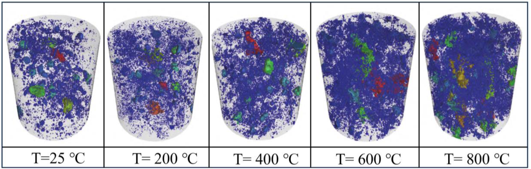 (2) The dynamic evolution of mesoscopic fractures under high temperatures is vividly illustrated by three-dimensional pore models. As the heating treatment temperature rises, the non-connected pores within the rock continuously expand and become interconnected, forming distinct thermal fracture planes at temperatures above 600°C. The mesoscopic structure of gneiss progressively fractures as the temperature increases, with structural damage accumulating gradually.