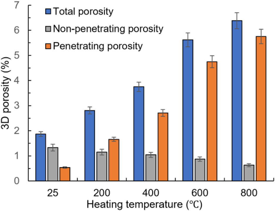 | Temperature (°C) | Mass loss rate (%) | 2D porosity (%) | Variance (%) | Maximum value (%) | Minimum value (%) | 3D porosity (%) |