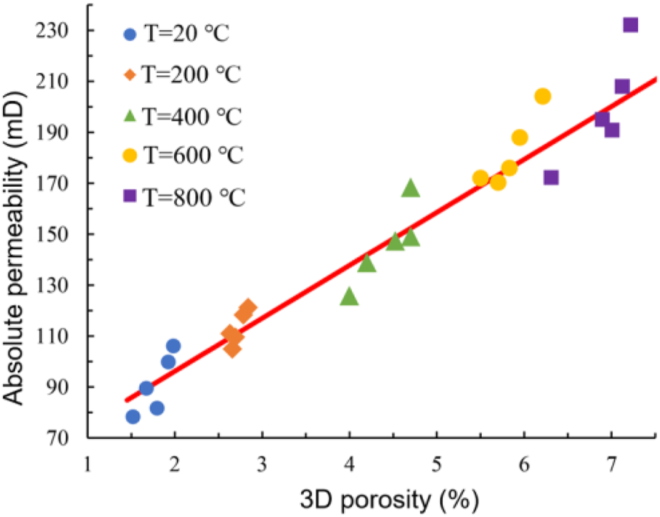 The three-dimensional pore model was used for seepage calculations, resulting in a streamline model of the gneiss, as shown in Figure 9. The density of the streamlines in the image is positively correlated with permeability, and the color of the streamlines relates to fluid pressure. As the number of connected fractures in the gneiss increased, no significant change in the colors of the streamlines was observed, but the density of streamline distribution significantly increased. At heating temperatures exceeding 600°C, through-going streamline trajectories formed in the gneiss, indicating a significant improvement in the rock’s permeability. The absolute permeability K of the rock was calculated from the seepage simulation. The results show that after the rock body underwent high-temperature treatment at 800°C, the increase in absolute permeability was approximately 135%. In this study, multiple cubic models were extracted from different locations within the three-dimensional fracture model for seepage simulation, and the permeability coefficients of the three-dimensional fracture model were calculated repeatedly. As shown in Figure 10, through data fitting and analysis, it was found that the total porosity and absolute permeability of the gneiss exhibited a clear linear correlation, indicating a strong relationship between permeability and the degree of rock fracturing.
