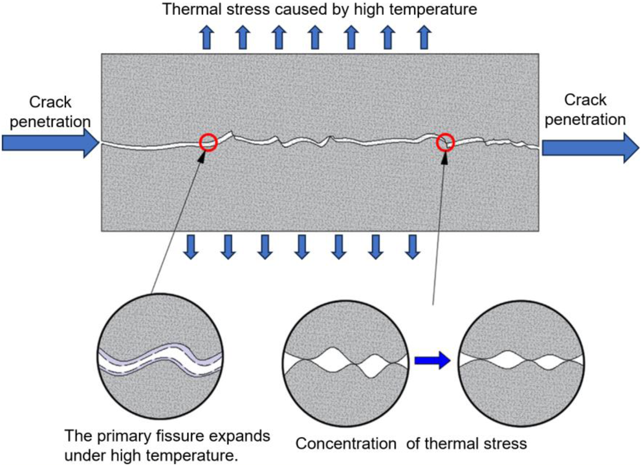 The fracture connectivity primarily involves changes in the physical and mechanical properties of gneiss under high-temperature conditions. When rock is subjected to high temperatures, a series of physical and chemical changes occur within it, significantly affecting its mechanical properties. Figure 12 shows a conceptual schematic diagram of the high-temperature-induced microstructural evolution and mechanical property degradation of gneiss. Rock inherently contains numerous micro-pores and micro-defects (Yin et al., 2019). As temperature increases, the micro-defects gradually develop and even connect into macroscopically visible fractures. When temperatures rise above 600°C, high temperatures cause minerals such as biotite and feldspar to decompose, undergo phase transformations, or even melt in gneiss. These changes in mineral composition disrupt the original microstructure and further promote the formation and extension of fractures (Costa et al., 2021). Under the sustained high-temperature heating, cracks within deep rocks gradually extend and connect, eventually forming a macroscopically visible network of cracks and achieving fractured permeability. With the expansion of rock cracks, the microstructure becomes increasingly loose and fragile, and it is more prone to fractured under the influence of external stress (Xu et al., 2020). Consequently, the mechanical properties of rock, such as compressive strength, elastic modulus, and cohesion, gradually decline with the rise in heating temperature.