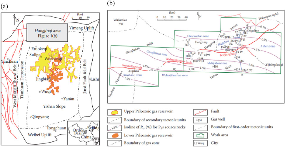 Figure 1. (a) Location of Hangjinqi area and the Ordos Basin; (b) location of Xinzhao zone an distribution map of the tectonic units, gas zones and gas (Wu et al., 2017).