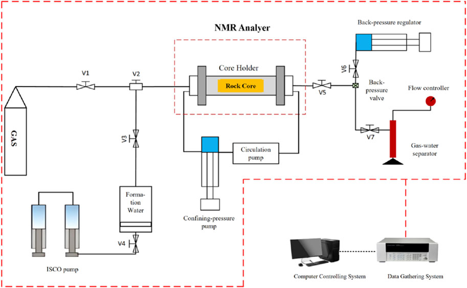 This study utilizes the MesoMR23-060HeI high-temperature, high-pressure nuclear magnetic resonance (NMR) online displacement system. The system incorporates a 0.3 T magnetic field strength, achieving operational parameters of 150°C maximum temperature and 70 MPa confining pressure, with minimum aperture resolution of 10 nm and liquid flow measurement accuracy of 0.01 mL/min. This combination of technical specifications enables precise control over experimental parameters during multiphase displacement processes. Figure 3 presents a schematic diagram of the dynamic NMR experimental setup, comprising a core holder, three precision pumps; and a computerized control system.