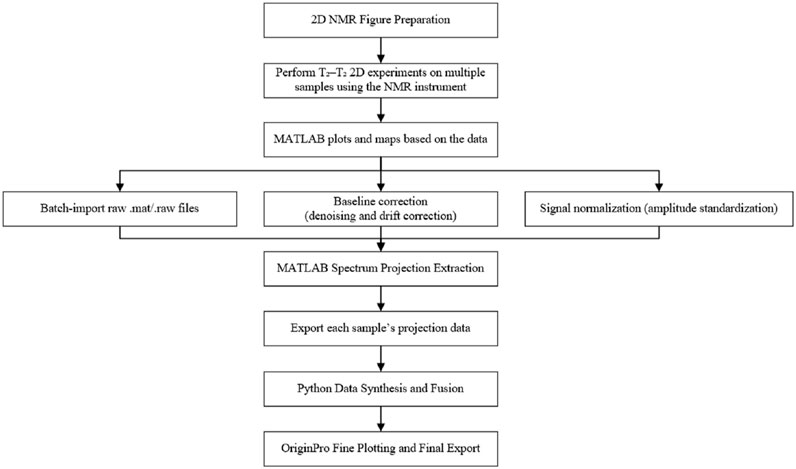 Based on experimental data comparative analysis and literature research, the workflow begins with conducting T2-T2 2D NMR experiments on multiple samples using an NMR analyzer to acquire raw data. Following this, the raw data files are batch-imported into MATLAB, where preprocessing steps such as baseline correction (denoising and drift removal) and signal normalization (amplitude standardization) are applied. The processed data are then visualized as 2D plots and contour maps, after which projection data, such as spectral peaks, are extracted and exported individually for each sample. Subsequently, Python is utilized to synthesize and fuse the exported projection datasets basing on the average brightness of each signal zone, integrating multi-sample information into a unified format. Finally, the synthesized data are imported into OriginPro for detailed graphical refinement, including axis labeling and color mapping adjustments, see Figure 4. As a result, the two-dimensional nuclear magnetic gas-water identification map of tight sandstone as shown in Figure 11 can be obtained.