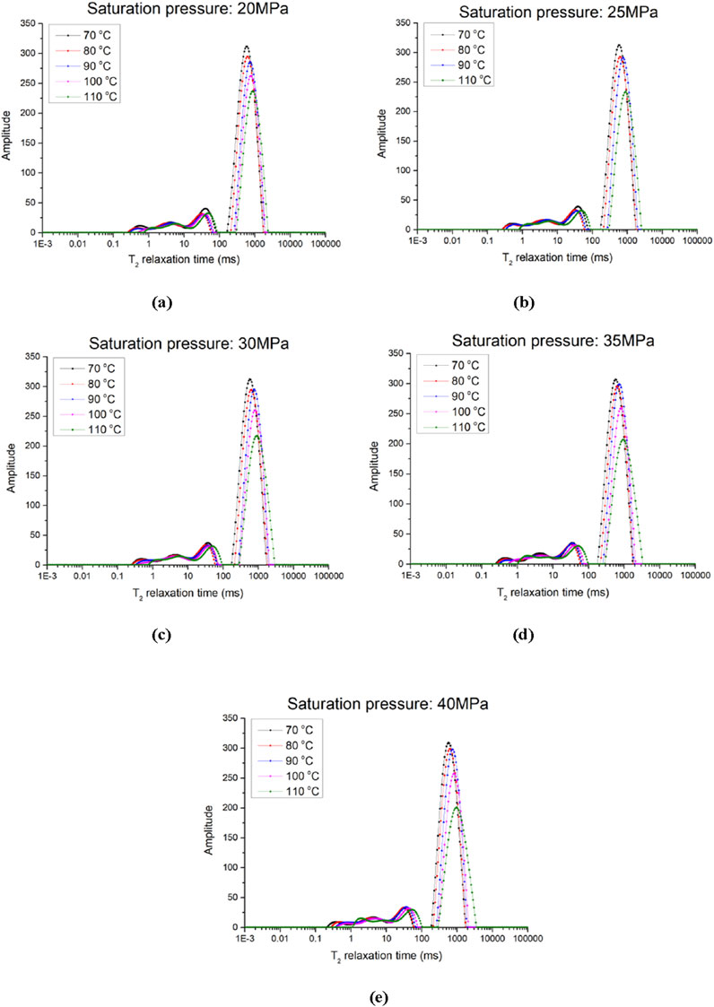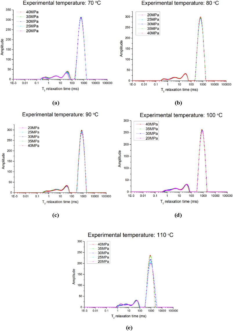 Figure 8. NMR T2 spectum of samples under different experimental temperature. (a) Saturation pressure: 20MPa, (b) Saturation pressure: 25MPa, (c) Saturation pressure: 30MPa, (d) Saturation pressure: 35MPa, (e) Saturation pressure: 40MPa.