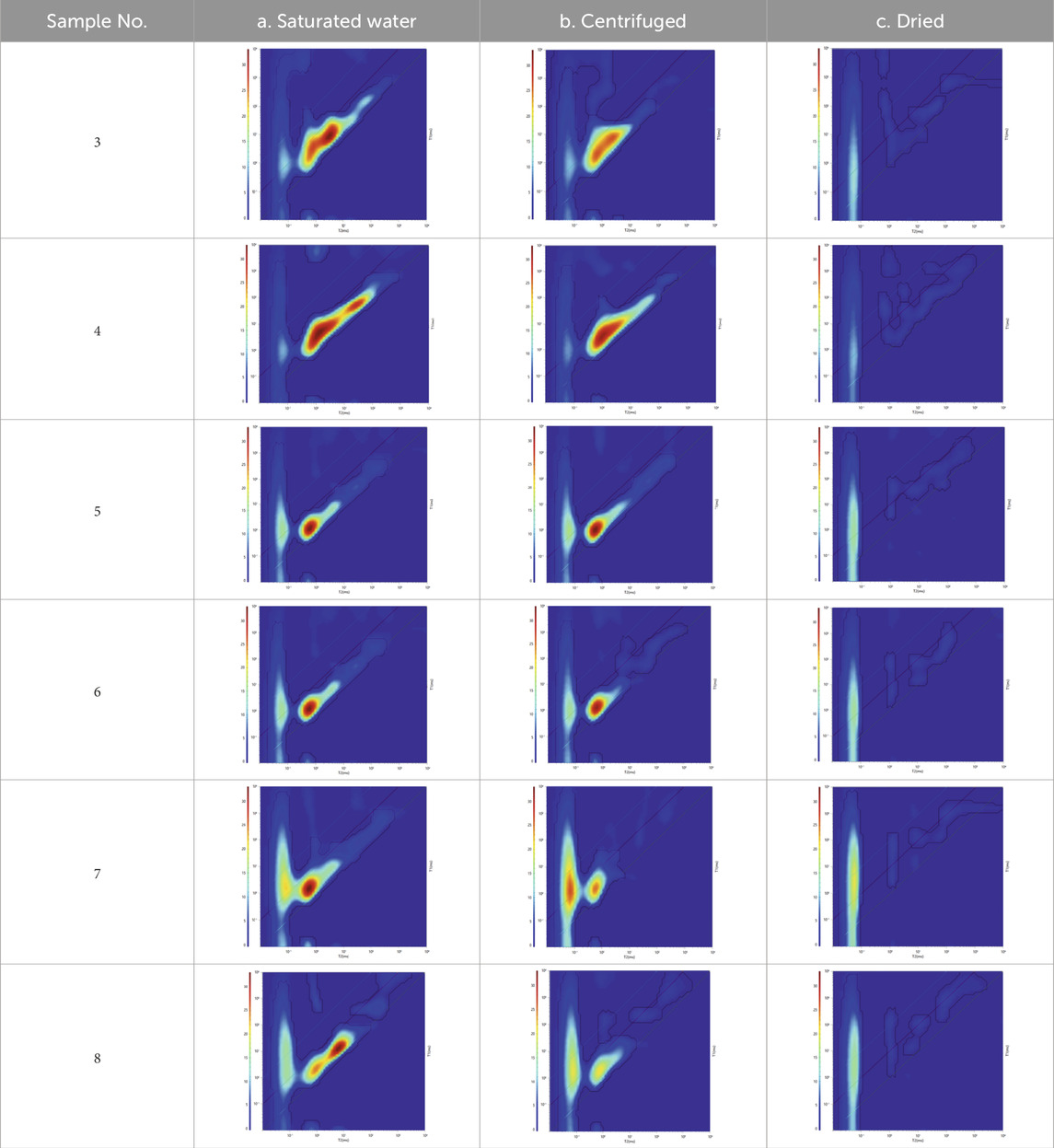 Based on the aforementioned results and the T1-T2 spectra of the dried and centrifuged samples, we performed a detailed analysis of the component signal positions. Table 3 illustrates the T1-T2 spectra of six samples under saturated, centrifuged, and dried conditions. A quantitative analysis of the component positions was conducted through comparative studies.