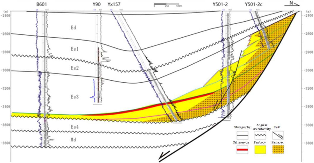 The mid-deep conglomerate complexes in the northern belt of the Bohai Bay Basin develop two genetic types: nearshore fans and turbidite fans. Vertically, they are distributed in two stratigraphic intervals: the Es4 (Shahejie Formation Member 4) and Es3 (Shahejie Formation Member 3). The eastern segment of the fault zone, previously underexplored due to significant burial depth, represents a key target for future reserve growth. The hydrocarbon accumulation in the northern belt sandy conglomerates complexes is dominantly controlled by reservoir properties. Areas with favorable rock physical characteristics—specifically the mid-fan to distal fan zones and fault-proximal regions—exhibit high hydrocarbon enrichment, forming structural-lithologic reservoirs. In the western sector, sandy conglomerates units have reported contingent reserves (Lower Es3 + Upper Es4). Conventional well testing yielded non-commercial results (“non-oil or dry”), while fracturing tests achieved moderate productivity of 5–8 t/d.