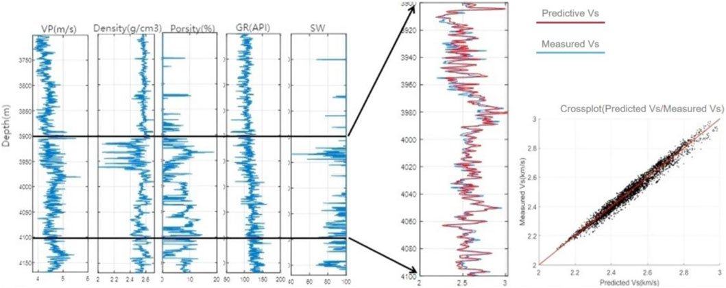 Taking Well Yi 288 as an example, the S-wave velocity was predicted by inputting parameters including P-wave velocity (Vp), density, porosity, gamma ray (GR), and water saturation (Sw). In the zoomed-in depth interval of 3,900–4,100 m, the predicted velocities (red curve) show high overlap with measured velocities (blue curve) as illustrated in Figure 3, demonstrating good agreement between modeling results and field measurements. While the empirical or SCA model provide unreasonable results lie out of the true values range. This is because the traditional method ignores the consolidation degree and the porosity effect.