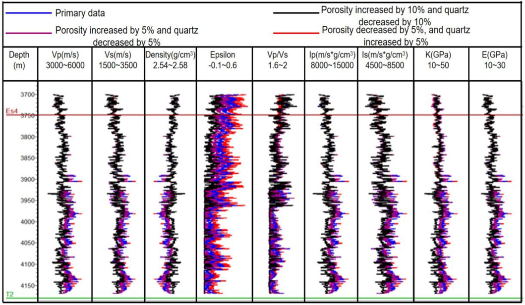 Taking Well Yi 288 as an example, a porosity model perturbation analysis was conducted by systematically varying porosity and quartz content to observe corresponding changes in logging curve responses. In Figure 4, the blue curve represents original data, the black curve corresponds to a 10% porosity increase with proportional 10% quartz reduction, the purple curve indicates a 5% porosity increase with 5% quartz reduction, and the red curve reflects a 5% porosity decrease with 5% quartz enhancement. Quantitative evaluation of sensitivity to porosity variations reveals that epsilon (ε) and bulk modulus exhibit significantly greater magnitude changes compared to other elastic parameters, as demonstrated in Figure 5.