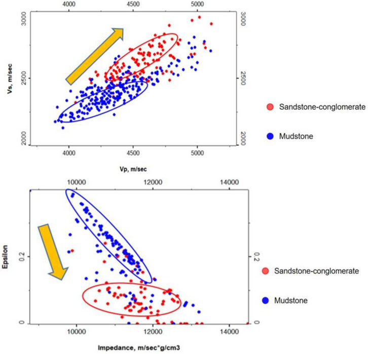 Given the dominant lithology of mudstone and sandy conglomerate in the study area, along with interbedded layers at certain depths, lithology differentiation is critical. The Vp-Vs crossplot (Figure 6a) demonstrates that sandy conglomerate intervals exhibit higher P-wave and S-wave velocities compared to mudstone intervals. Furthermore, the crossplot of P-wave impedance versus anisotropy parameter (epsilon) (Figure 6b) shows reduced anisotropy and a deteriorated linear correlation between anisotropy and impedance in sandy conglomerate intervals.
