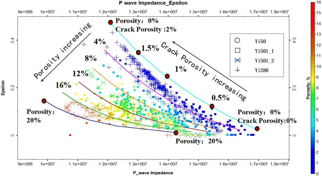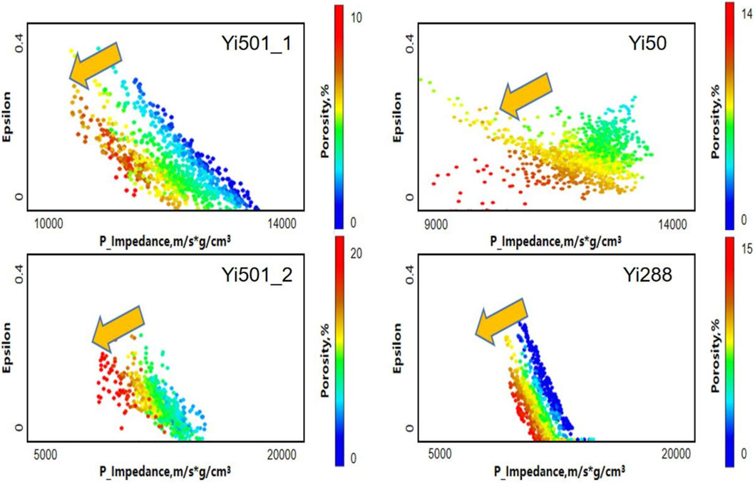 A rock physics template was established based on the distinct correlation pattern observed in the P-wave impedance versus epsilon (ε) crossplot (Figure 8) to quantitatively differentiate porosity variations within conglomerate intervals. This template integrates data from four wells (Yi-50, Yi-288, Yi-501_1, and Yi-501_2), demonstrating a progressive porosity increase trend from the upper-right to lower-left regions. Notably, most sandstone interval data points are effectively discriminated by this template. The developed rock physical template will guide optimal selection of porosity inversion methodologies in subsequent workflows.