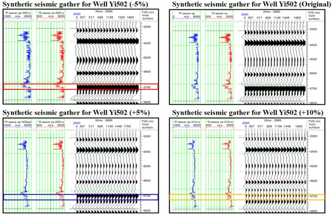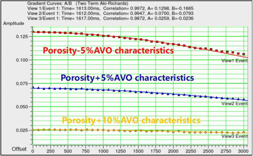Comparative analysis of AVO response characteristics induced by porosity variations in Well Yi 502 reveals systematic changes at the target strong reflection interface. The interface predominantly exhibits Class I AVO response. With increasing porosity, velocity decreases lead to attenuation of Class I AVO characteristics, manifested as diminished reflection amplitude energy, reduced complex wave phenomena, and emergence of dual-peak reflection signatures (Figures 9, 10). This demonstrates that porosity variations not only alter elastic parameters at the logging scale but also induce distinct seismic response modifications at the seismic scale. The dual-peak reflection pattern can be interpreted as a diagnostic seismic signature associated with porosity variations.