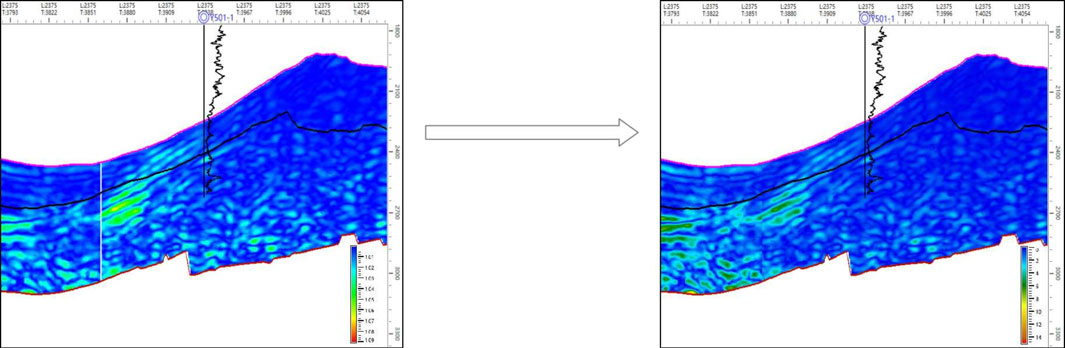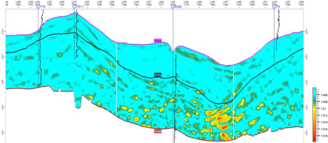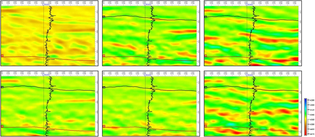Through statistical analysis of the target interval’s acoustic interval transit time logs, a mean P-wave velocity of 4,300 m/s as the constant low-frequency component and an extreme relative value of 500 m/s. Well-unconstrained seismic inversion of P-wave velocity was conducted for each sector, yielding six sector-based P-wave velocity datasets.