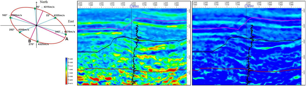 Taking gather data Gather2 as an example, the S-wave velocity inversion was performed for each sector well-unconstrained, yielding six sector-based S-wave velocity data. Since each sector is given a constant low frequency component, the original difference in the velocity of the S-wave in each sector is preserved. The S-wave velocity can also be obtained by using the well-constrained seismic inversion method, but it should be noted that the inversion results are not too strongly constrained by the well data, so as to avoid the convergence of the inversion results of the S-wave velocities in six different sectors, which will flatten their due differences, thus failing to complete reasonable elliptical fitting processing and determine the direction and magnitude of fast and slow -wave velocities. The well-unconstrained S-wave velocity inversion results from six azimuthal sectors in gather data Gather2 demonstrate that the vertical velocity variations within the target interval (2,700–3,200 ms) of each sector align with the trends observed in wireline P-wave velocity logs.
