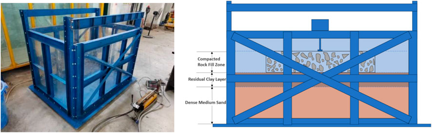 Geotechnical data from the K66 + 080–K66 + 321 section of a highway project show that the weak foundation consists mainly of soft-plastic silty clay (1.4–1.7 m thick, averaging 1.5 m), overlying highly weathered red bed soft rock. The model replicates this profile with a dual-layer structure: a 1.5 m-thick upper layer of soft-plastic silty clay and an underlying red bed soft rock base. Key physical and mechanical properties of the silty clay are summarized in Table 1. Figure 1 shows the test tank used in the experiment. A geometric similarity ratio of CL = 5:1 was adopted based on similarity theory. A custom model test system was constructed with internal dimensions of 1.5 m × 1.25 m × 1.0 m. The test tank includes a rigid base made of an 8 mm-thick Q235 steel plate. The sidewalls consist of a channel steel frame with 10 mm-thick plexiglass panels. Rubber water stop were added at joints, and the tank was assembled modularly using high-strength bolts.