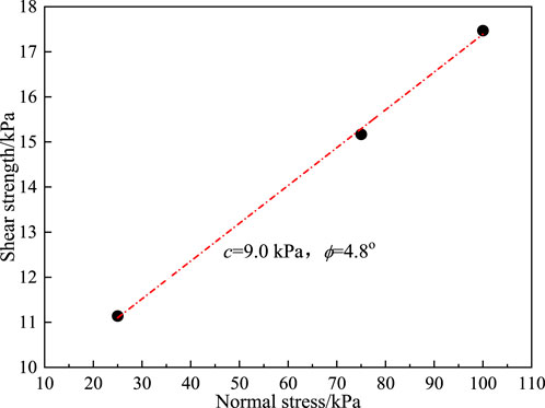 2. Soft-plastic silty clay: Simulated using remolded clay prepared by adding water to reach a fluid-plastic state, then compacted in layers. The shear strength normal stress curve and the e–p curve are shown in Figures 2, 3, with key parameters listed in Table 2.