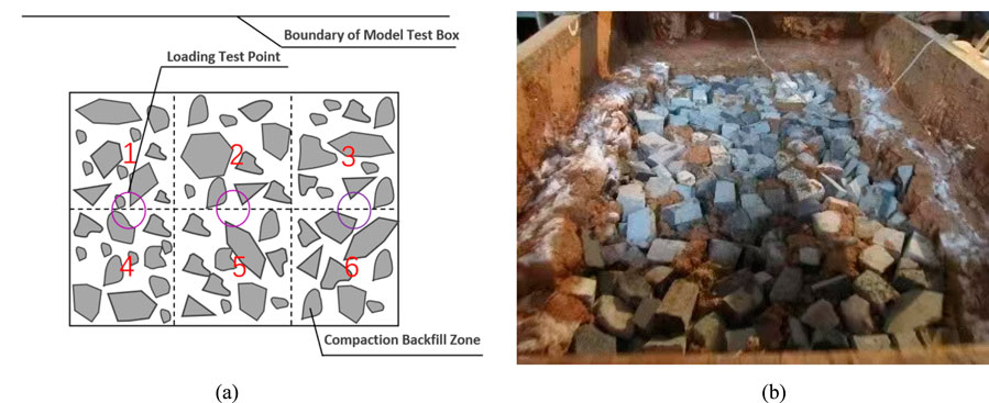 Field testing is often limited by challenging site conditions and the high cost of labor and materials. Scaled physical model testing offers a cost effective and efficient alternative for engineering research. This study develops a physical model based on similarity principles, using precise instrumentation to maintain controlled boundary conditions (Zhu H. et al., 2025). It systematically investigates the mechanical behavior of compacted rock fill reinforcement in soft foundations, emphasizing strength development and deformation behavior of the composite foundation (Yang et al., 2024). A key consideration for field application is the scale effect. While adhering to fundamental similarity principles (Cγ = Cφ = Cc = Cμ = 1:1), geometric scaling (CL = 5:1) simplifies complex field interactions. Prototype rock properties (e.g., angularity) are challenging to scale perfectly, and boundary effects in the test tank differ from the semi-infinite natural subgrade. Consequently, while the model tests reliably identify optimal parameters (e.g., 9 cm model size ≈45 cm prototype) and qualitative trends, direct quantitative extrapolation of absolute values (e.g., settlement) requires caution. The empirical formulas are most valuable for predicting relative improvement and guiding preliminary field design. The objectives of the tests are to: