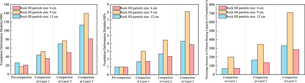 1. An optimal rock fill particle size of 9 cm yielded the highest enhancement in bearing capacity and deformation modulus. Particle sizes smaller (6 cm) or larger (12 cm) led to diminished performance, suggesting nonlinearity and the importance of size optimization.