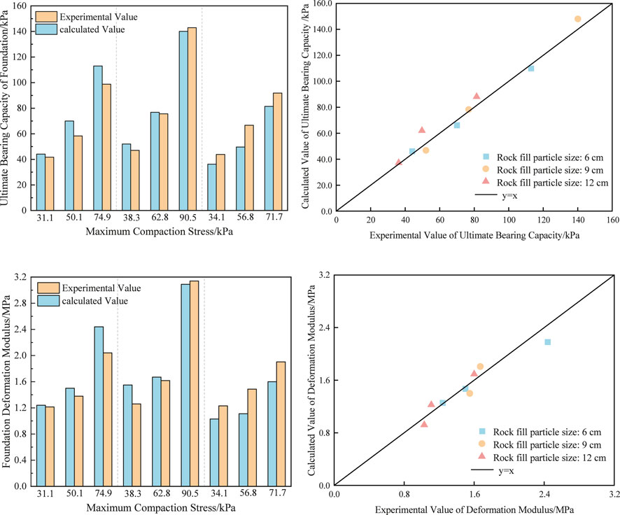 2. The ultimate bearing capacity and deformation modulus showed strong positive correlations with maximum compaction stress. Revised empirical formulas accounting for both stress and particle size achieved high predictive accuracy, with average relative errors below 7.37%.