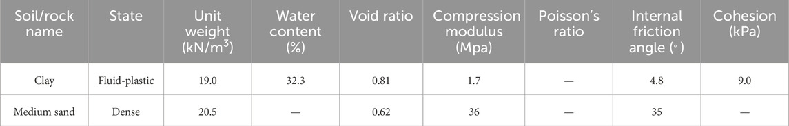 Based on representative stratigraphic features, the test simulated two geotechnical materials: soft-plastic silty clay and red bed soft rock. The model strictly followed similarity principles, applying key similarity ratios: unit weight Cγ = 1:1, deformation CE = 1:1, Poisson’s ratio Cμ = 1:1, and strength parameters Cc = 1:1, Cφ = 1:1. The following methods were used to simulate the materials: