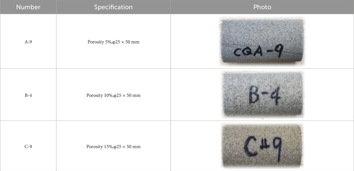 Artificial sandstone cores (supplied by Yilai Bo Technology Co., Ltd.) with porosities (5%, 10%, 15%) were used, and their porosity accuracy was pre-tested (Table 1).