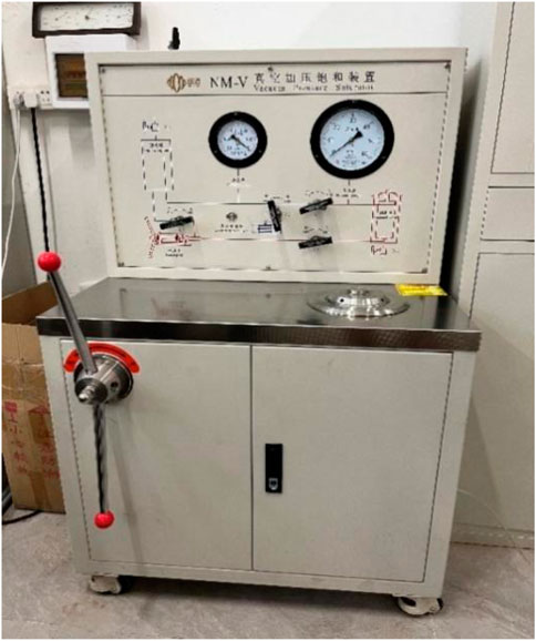 Cores were fully saturated with water using a vacuum-pressure saturation device (Figure 2) to ensure uniform wetting. This device is primarily composed of a vacuum system, a liquid storage tank, a sample saturation chamber, a manual pump, a pressure gauge, and valves. When the liquid level in the storage tank ceases to drop, the valve is closed, and the hand pump is used to pressurize to 25 MPa, with this pressure maintained for 24 h. At this stage, the core is considered to be fully water-saturated.