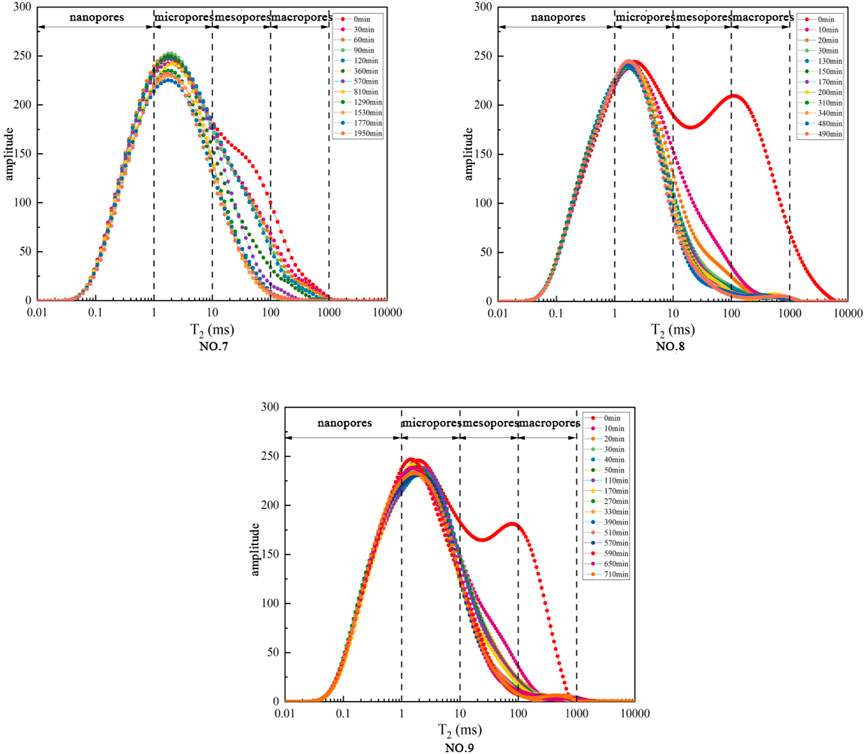 T2 curves (Figures 3–5) show bimodal distributions for cores A-9 and B-4, with rapid water loss in macropores/mesopores and slow loss in micropores/nanopores. Core C-9 exhibits rapid initial displacement, with most water removed within 10 min.