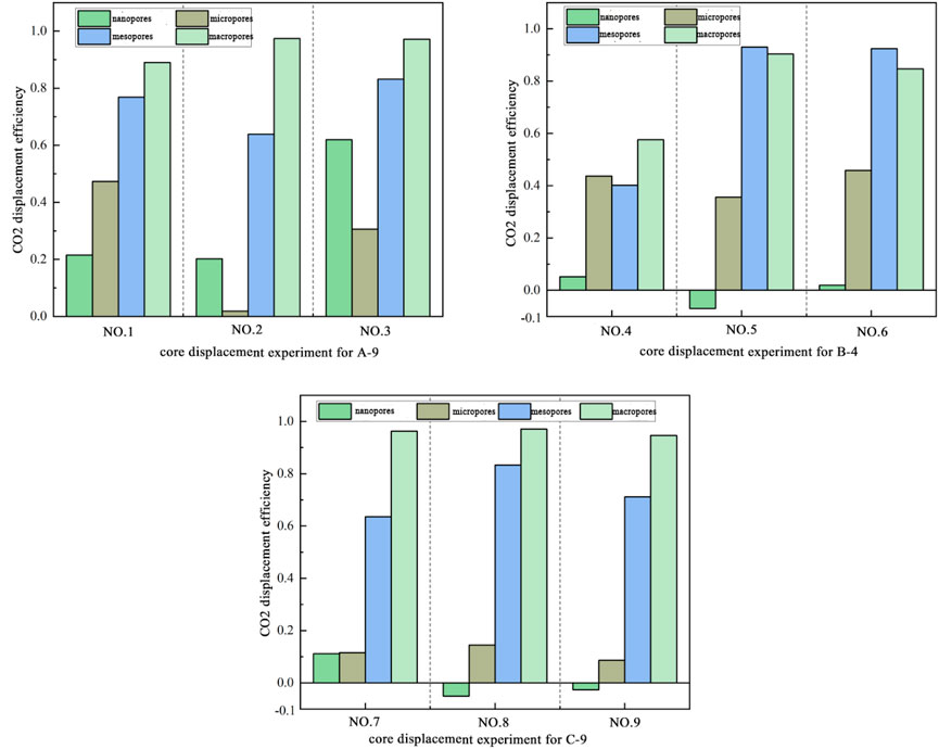 To conduct an in-depth analysis of displacement processes across different pore size groups, the final CO2 displacement efficiency for each pore size group in each experimental set was calculated using the initial T2 curve from the displacement experiment and the T2 curve at the final state upon displacement completion. The formula for calculating CO2 displacement efficiency is as follows.