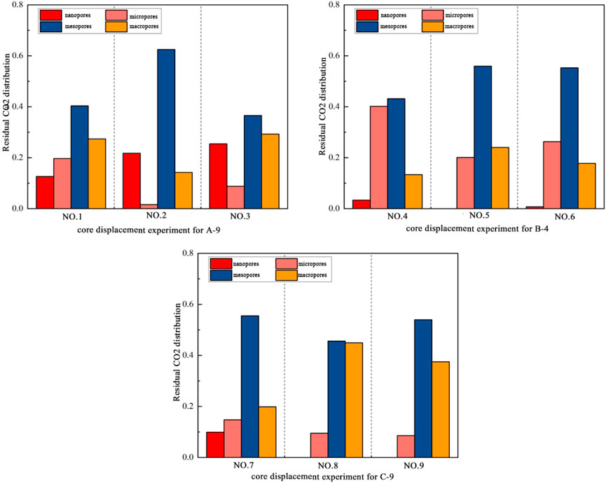 Water can only migrate into nanopores if the pressure is sufficient to overcome the capillary entry pressure, which is typically high due to the small pore radii. CO2 displacement efficiency (Figure 6) shows that mesopores and macropores have displacement efficiencies of >60% and >80%, respectively, while nanopores and micropores have <50%. Negative efficiency in some nanopore calculations (Groups 5, 8, 9) reflects water influx from larger pores. The distribution of residual CO2 (Figure 7) shows that mesopores hold ≥40% of residual CO2, due to their higher proportion in the pore structure and the limited space in nanopores/micropores occupied by residual water.