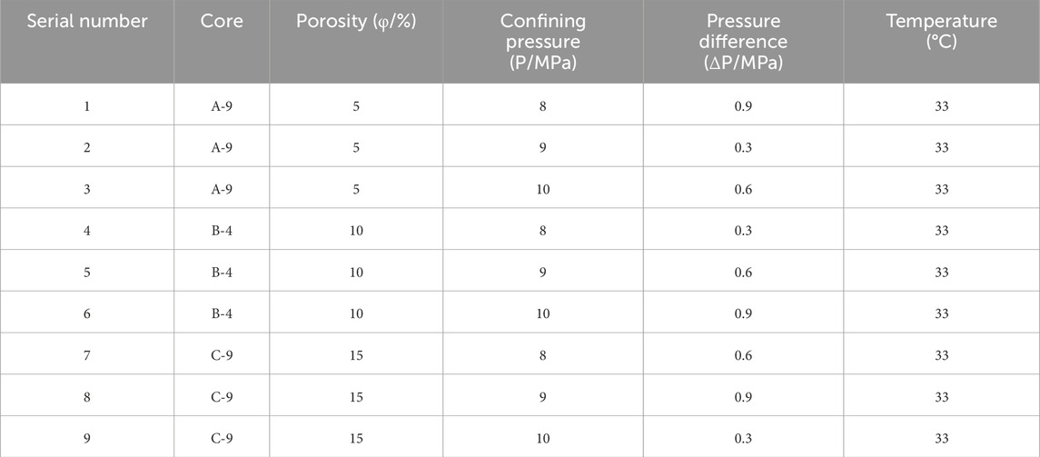 A three-factor, three-level orthogonal design (L9 (33)) was adopted, with variables including porosity (5%–15%), confining pressure (8–10 MPa), and pressure difference (0.3–0.9 MPa), while temperature was maintained constant at 33 °C. Details of the nine experimental groups are provided in Table 2.
