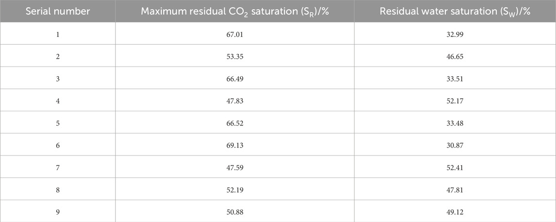 Table 4. Maximum residual CO2 saturation (SR) and residual water saturation (SW) in displacement experiments of artificial cores.