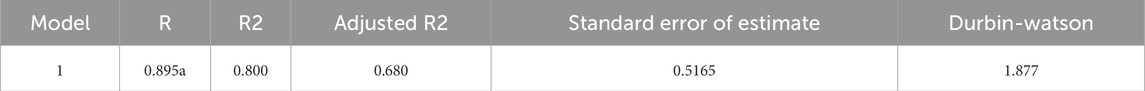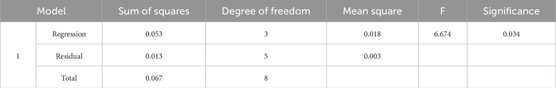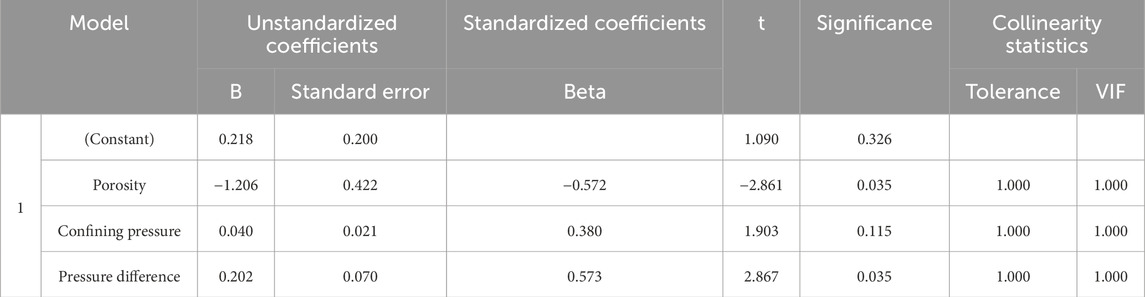 Assuming no interference from other factors and the generalizability of laboratory results, SPSS was employed to construct a regression model. The model (Table 5) showed an R 2 = 0.80, indicating that 80% of the variation in SR is explained by the three factors. The Durbin-Watson statistic (1.877) confirmed the independence of the data. ANOVA (Table 6) indicated a significant model fit (F = 6.674, p < 0.05).