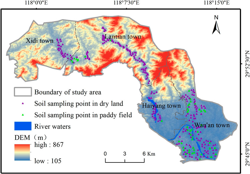 Soil samples were collected in farmland in Xidi Town, Lantian Town, Haiyang Town, and Wan’an Town in accordance with the “Land Quality Geochemical Evaluation Specification” (GB/T 0295–2016). The sampling depth was 0–20 cm, with a sampling density of 5 points/km2. Sampling points were appropriately densified in valley areas. During sampling, areas with recent human pollution or recent land accumulation were avoided. Using the “plum blossom sampling method,” multiple points were sampled, and plant roots and other debris were removed. Finally, the samples were mixed into one sample, with each sample weighing no less than 1,000 g. A combination of grid-based and random sampling methods was used, with a total of 300 sampling points, including 49 paddy field points and 251 dryland points (Figure 1 for specific sampling point distribution).