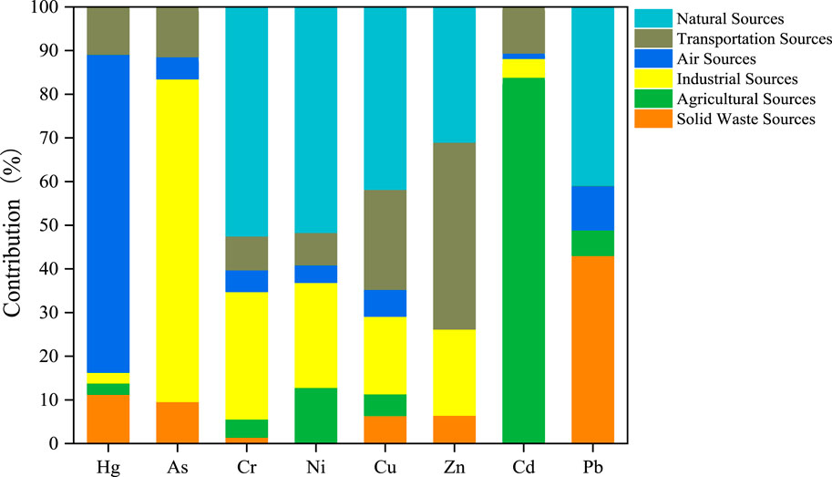 This study performed PMF source apportionment of the eight heavy metals in the soil. The model parameters showed that when the number of sources was set to 6, the correlation coefficient r2 of the heavy metals, except for Cu (0.822), was above 0.9, indicating good model performance (Table 5). The results of the PMF source apportionment (Figure 4) showed that soil heavy metal pollution was mainly influenced by traffic sources, natural sources, atmospheric sources, industrial sources, agricultural sources, and solid waste sources. Atmospheric sources contributed the most to Hg, accounting for 72.8% of the total contribution. As was mainly influenced by industrial sources, with a contribution rate of 73.9%. Natural sources were the main contributors to Cr, Ni, and Cu, accounting for 52.5%, 51.7%, and 41.8%, respectively. Zn was mainly derived from natural and traffic sources, accounting for 31.0% and 42.8%, respectively. Cd was primarily affected by agricultural activities, with agricultural sources contributing 83.9%. Pb was mainly influenced by natural and solid waste sources, accounting for 40.9% and 43.1%, respectively.