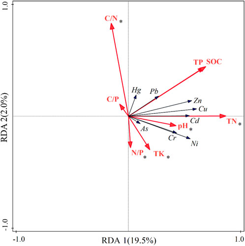 The coordination and driving relationship between soil nutrient factors and heavy metal content: On the one hand, heavy metal emission sources can contribute compounds containing C, N, and P to the soil. On the other hand, heavy metals in the soil are influenced by nutrient factors, altering their speciation and mobility (Tian et al., 2025). In this study, soil SOC, TN, and TP showed significant positive correlations with Ni, Cu, Zn, Cd, and Pb (p < 0.05) (Figure 7), and similar results were indicated by the structural equation model. The reasons may be as follows: from the perspective of pollution sources, traffic activities (such as automobile exhaust emissions and tire wear) release nitrogen oxides into the soil, increasing the nitrogen content contributed by traffic sources (Li Y. R. et al., 2025). This is consistent with the significant correlations between Cu, Ni, Zn, and Pb and TN in this study (Figures 7–9). Regarding solid waste sources, studies have shown that urban sewage sludge compost can increase soil organic carbon, total nitrogen, and total phosphorus, but also poses a risk of Pb pollution (Xu et al., 2016), which may explain the positive path relationships between TOC and TK and Pb in this study. In agricultural activities, wastewater irrigation and the application of straw or livestock manure as alternatives to chemical nitrogen fertilizers can introduce Cd into the soil while also adding extra C, N, and P (Drabesch et al., 2024). Notably, straw, as a high C:N compound, can increase the C:N and C:P ratios in the soil upon application (Wang et al., 2023). Additionally, the use of phosphate fertilizers containing Cd impurities is considered an important cause of Cd contamination in farmland (Kubier et al., 2019). These results suggest that there are complex interactions between heavy metals and nutrients in soil.