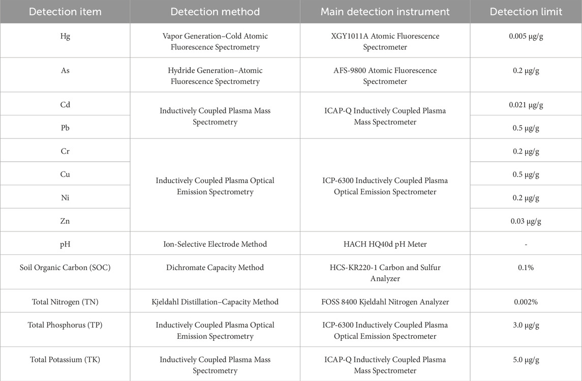 After natural air-drying, the soil samples were preliminarily processed, crushed manually with a wooden hammer, and passed through 100-mesh and 200-mesh sieves. The samples were then divided using the quartering method and transported to the laboratory. The soil samples were analyzed by the Yantai Coastal Zone Geological Survey Center of the China Geological Survey, following the standards of the “Regional Geochemical Sample Analysis Method” (DZ/T 0279.27–2016) and the “Determination of Sulfur Content in Gold Ores by High-Frequency Combustion Infrared Absorption Method” (SN/T 4366–2015). The detection parameters included As, Cd, Cr, Cu, Pb, Hg, Ni, Zn, pH, total nitrogen, total phosphorus, total potassium, and soil organic carbon. Specific detection methods are shown in Table 1.