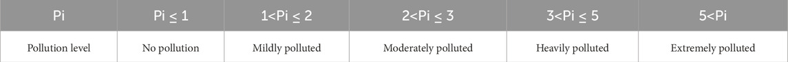 The single factor pollution index method determines the degree of pollution by comparing the measured value with the corresponding standard or background value (Yang P. Z. et al., 2024). The calculation formula is shown in Equation 1.