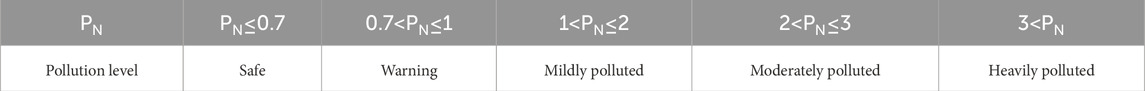 The Nemero pollution index method evaluates soil pollution by calculating the arithmetic mean and maximum value of multiple pollutant single factor pollution indices, providing a more comprehensive pollution assessment (Zhang et al., 2024). The calculation formula is shown in Equation 2.