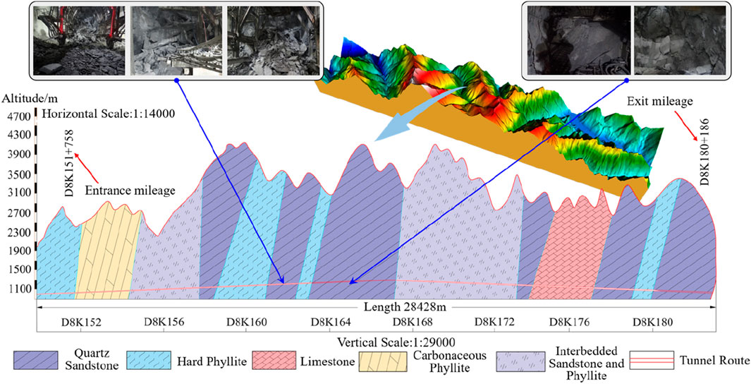 The tunnel site lies within a denuded, deeply cut middle mountain canyon characterized by vertical and horizontal valleys, with steep walls in some areas. The tunnel traverses’ numerous streams, such as Longtang Groove and Shidaguan. It is situated approximately 3–4 km from an active fault along the Min River. This proximity to the fault has led to significant rock structure development at the tunnel site. Construction observations indicate that the surrounding rock primarily consists of intact hard sandstone and limestone, with a maximum natural compression resistance of 127.7 MPa. The measured maximum horizontal principal stress is 31.5 MPa. The strata traversed by the tunnel are predominantly thin to medium-thick layers, partially sandwiched with thick layers, while the dip angle of the rock strata range from horizontal to steep. The excavation in deep-buried, hard, and intact surrounding rock was affected by factors such as high stress, strong disturbance, high osmotic pressure, and unfavourable structural surfaces, resulting in high-intensity rock bursts. Statistical analyses revealed that rock bursts in the Ping’an tunnel frequently occurred in Grade II and Grade III surrounding rock sections, which exhibit relatively complete geological structures and fracture zones where tectonic stress is concentrated. The occurrence of rock bursts poses serious threats and challenges to the safety of personnel during tunnel construction.