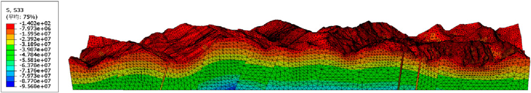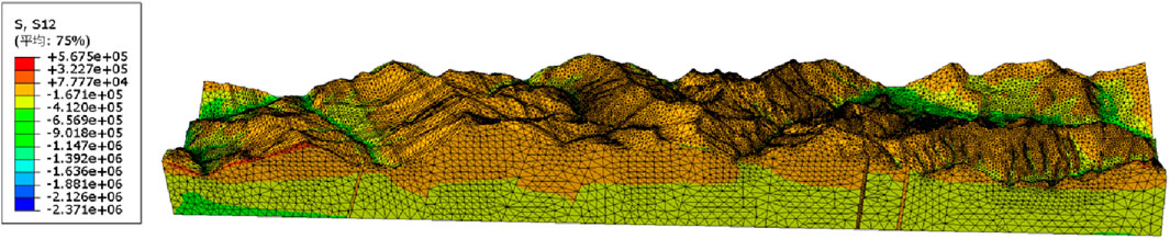 The constraints on the unloaded side and bottom boundaries were consistent with those used for the self-gravity stress field. Displacement boundaries were introduced to simulate shear stress in the horizontal plane.