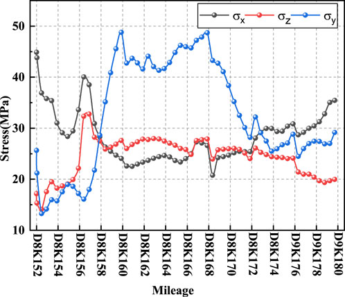 To quantitatively analyse the regression results of the Ping’an tunnel, stress components along the tunnel axis were extracted at intervals of 500 m. The variations of in-situ stress in three directions, the longitudinal and lateral pressure coefficients, and the variation of horizontal principal stress along the tunnel axis are illustrated in Figures 9–11.