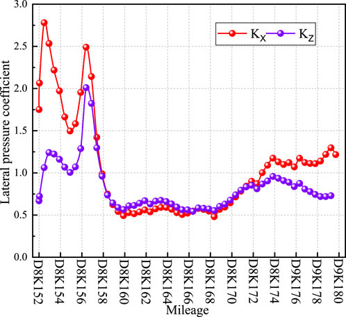Figure 11 shows the variations in the longitudinal (KX) and transverse (KZ) lateral pressure coefficients of the Ping’an tunnel with respect to mileage. It was observed that the lateral pressure coefficients at shallower buried depths (D8K152 to D8K157, D8K174 to D9K180) were generally greater than 1 due to the influence of synclines, anticlines, folds and faults. This indicates that the geological tectonism has a significant impact, with tectonic stress dominating. The self-gravity stress increased as buried depth increased. However, when the buried depth exceeded 1,000 m (D8K158 to D8K172), the lateral pressure coefficient stabilized, with most sections exhibiting values less than 1. This suggests that at greater buried depths, the tectonic stress stabilized, and the in-situ stress became predominantly influenced by the self-gravity stress.