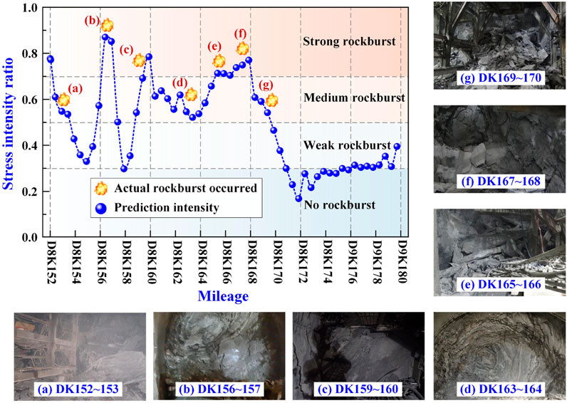 The inversion results of the in-situ stress derived from data simulation provide a preliminary evaluation of the likelihood of rockbursts in the Ping’an Tunnel. Furthermore, the actual number of rockburst events observed during tunnel construction was recorded on site. Figure 13 presents both the assessment results and the recorded rockburst events.