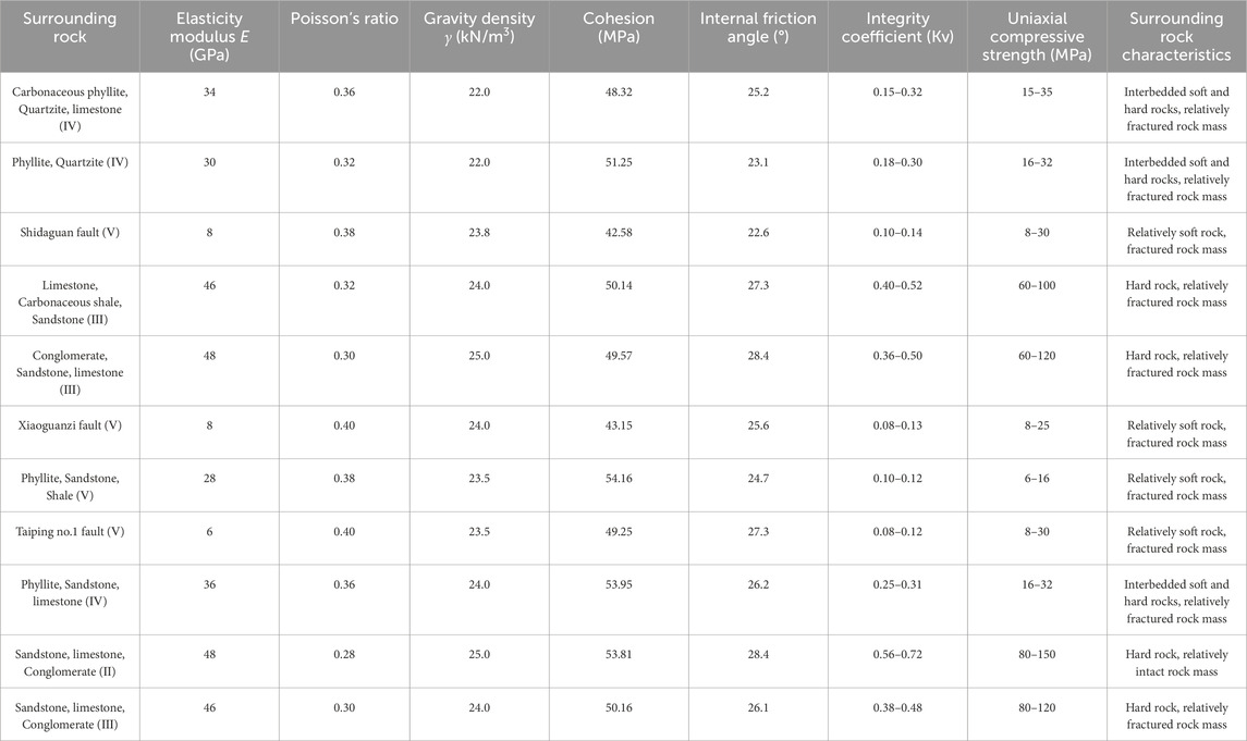 The Ping’an tunnel extends from D8K151 + 760 to D9K180 + 186, with a total length of 28.428 km. The model established for the tunnel has an axial length of 28.428 km and a lateral width of 5,000 m. It comprises 909,270 nodes and 606,873 elements, as shown in Figure 3. The elastic constitutive model was employed for the calculations, and the mechanical parameters of the rock masses were determined comprehensively based on geological survey data and laboratory test results, as presented in Table 2. Subsequent studies have shown that rockbursts generally occur in Class II and Class III hard surrounding rocks, which are capable of storing large amounts of elastic strain energy. The bottom boundary of the model was constrained to prevent displacement in the Z-direction, while the upper boundary was designed as a free surface. Additionally, gradient stresses were applied to the side faces to simulate tectonic extrusion in both the east-west and north-south directions. In the numerical model, the interaction between different rock types was defined using tie constraints, while the interaction between the fault and the surrounding soil was modeled using surface-to-surface contact that allows relative sliding.
